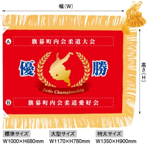ポリエステルの生地に、美しい印刷が特徴の昇華転写プリントを施した、高級感のある優勝旗です。周囲にはフリンジをあしらい、付属の房を取り付ければどこから見ても本物の優勝旗です!