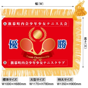 ポリエステルの生地に、美しい印刷が特徴の昇華転写プリントを施した、高級感のある優勝旗です。周囲にはフリンジをあしらい、付属の房を取り付ければどこから見ても本物の優勝旗です!