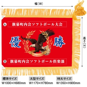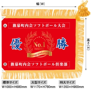 ポリエステルの生地に、美しい印刷が特徴の昇華転写プリントを施した、高級感のある優勝旗です。周囲にはフリンジをあしらい、付属の房を取り付ければどこから見ても本物の優勝旗です!